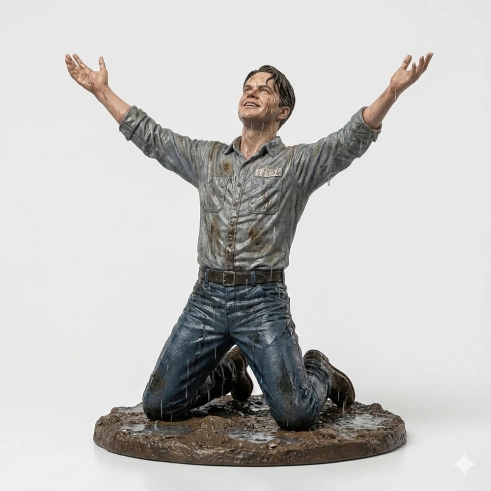 Esta estatua no muestra a un hombre cualquiera; muestra el triunfo del espíritu humano. Captura el instante exacto en que Andy, tras arrastrarse por las tuberías de Shawshank, se arranca la camisa de presidiario y siente la lluvia limpiar dos décadas de injusticia. La postura, con los brazos abiertos hacia el cielo, es un grito silencioso de libertad que ahora puedes exponer en tu colección.