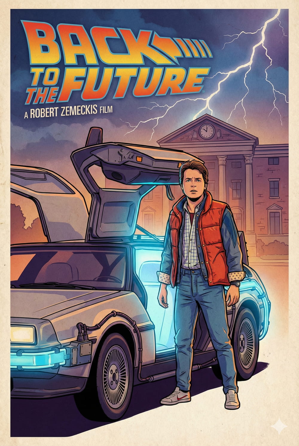 La Atmósfera: El fondo captura la tensión de la escena culminante en Hill Valley, con la torre del reloj y el rayo cruzando un cielo dramático, todo envuelto en la energía azul brillante del viaje temporal.